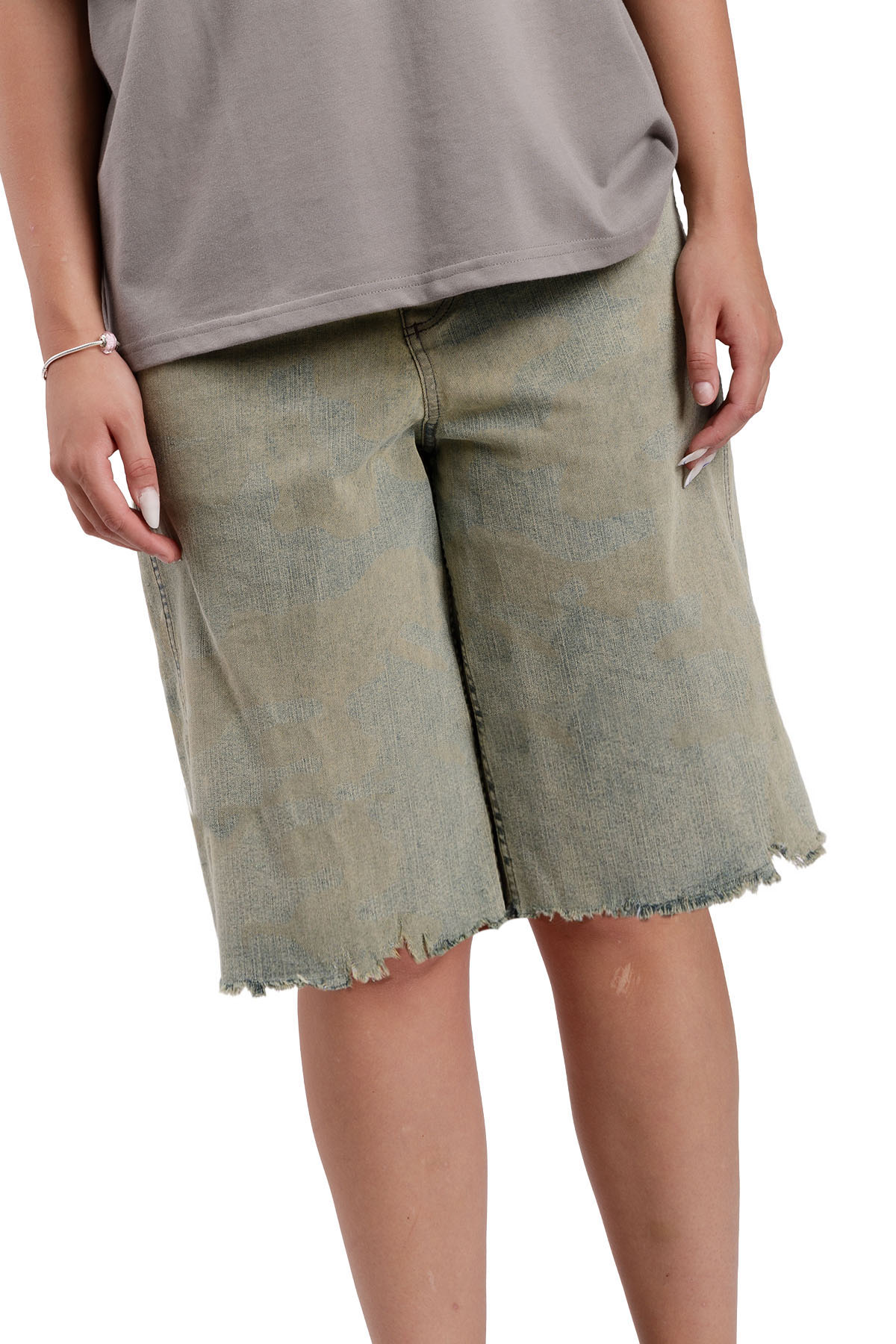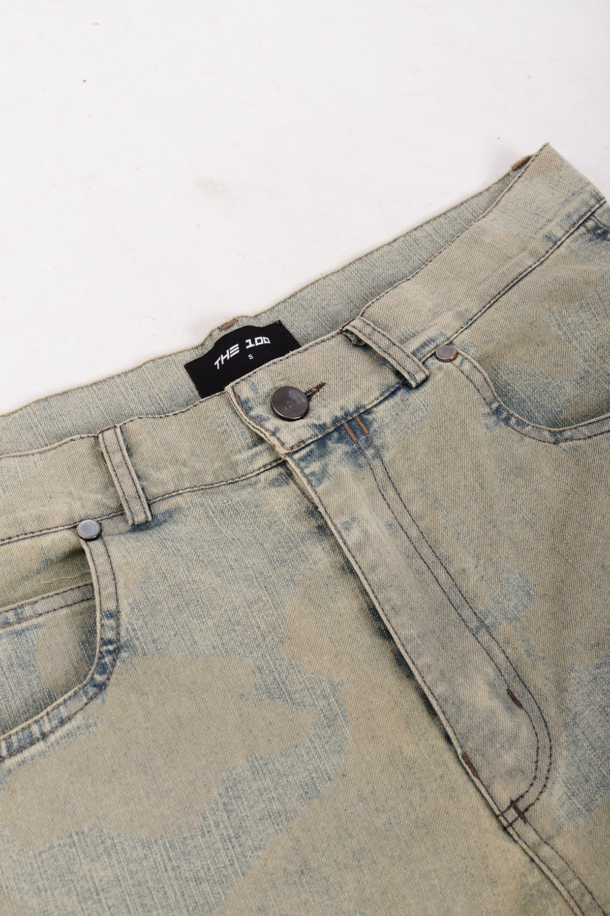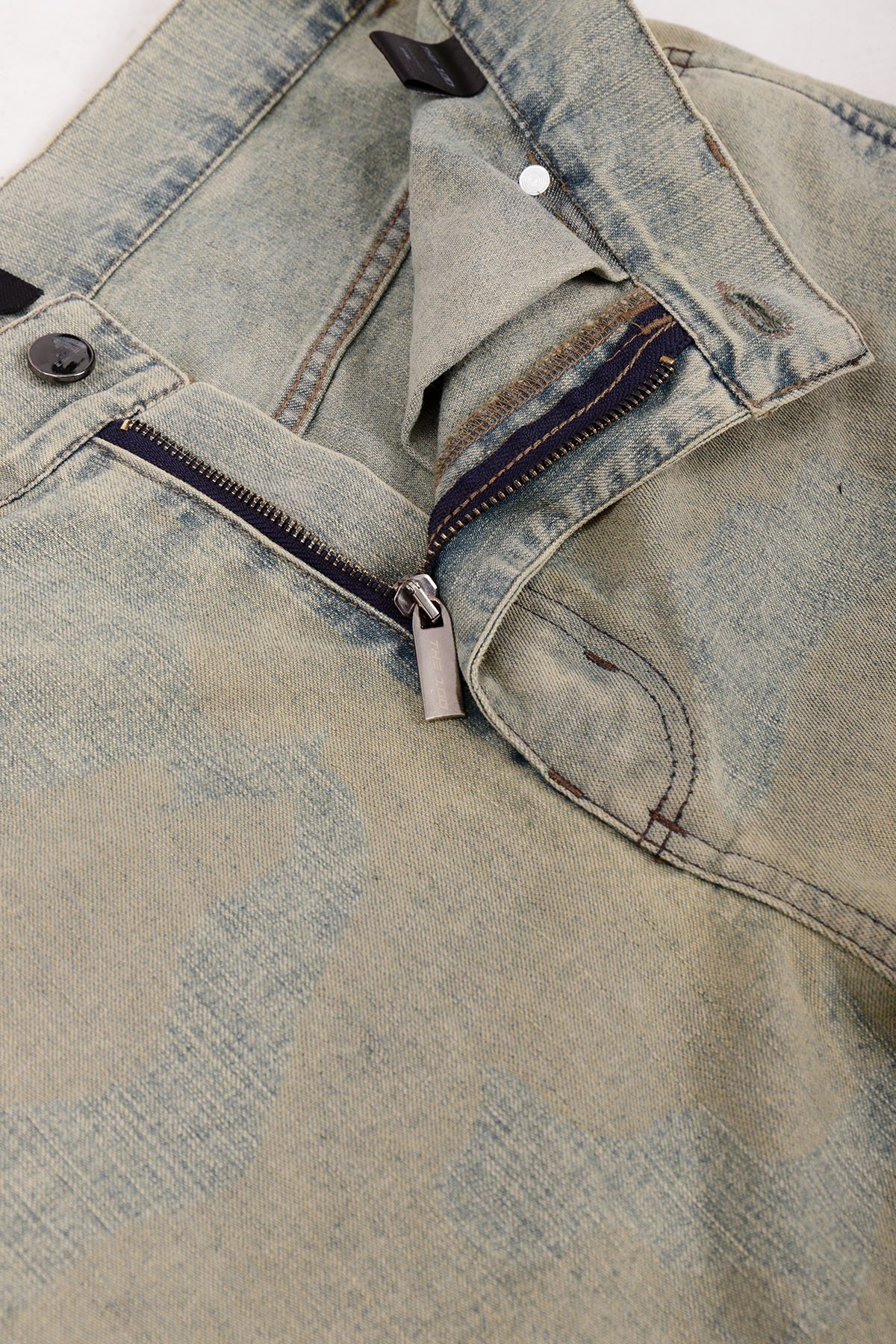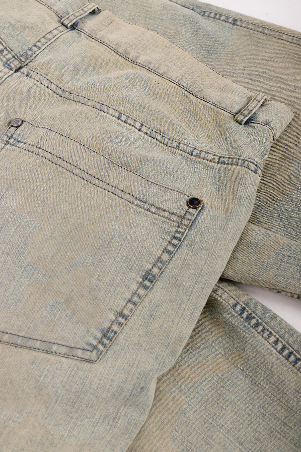 Wzór moro naniesiony metodą laseru. Surowe wykończenie nogawek.