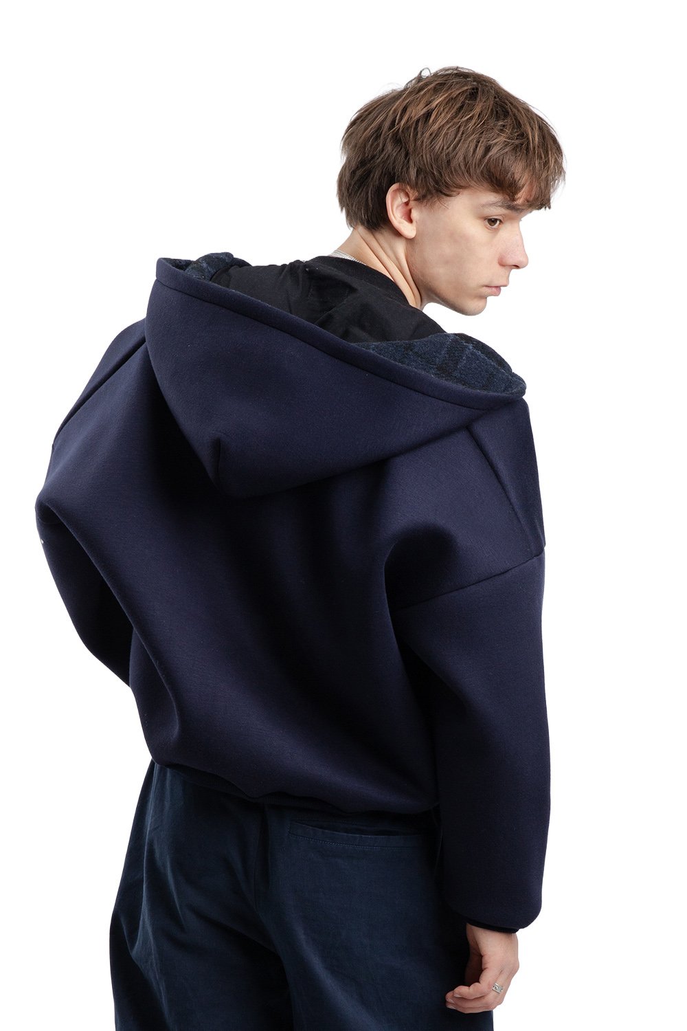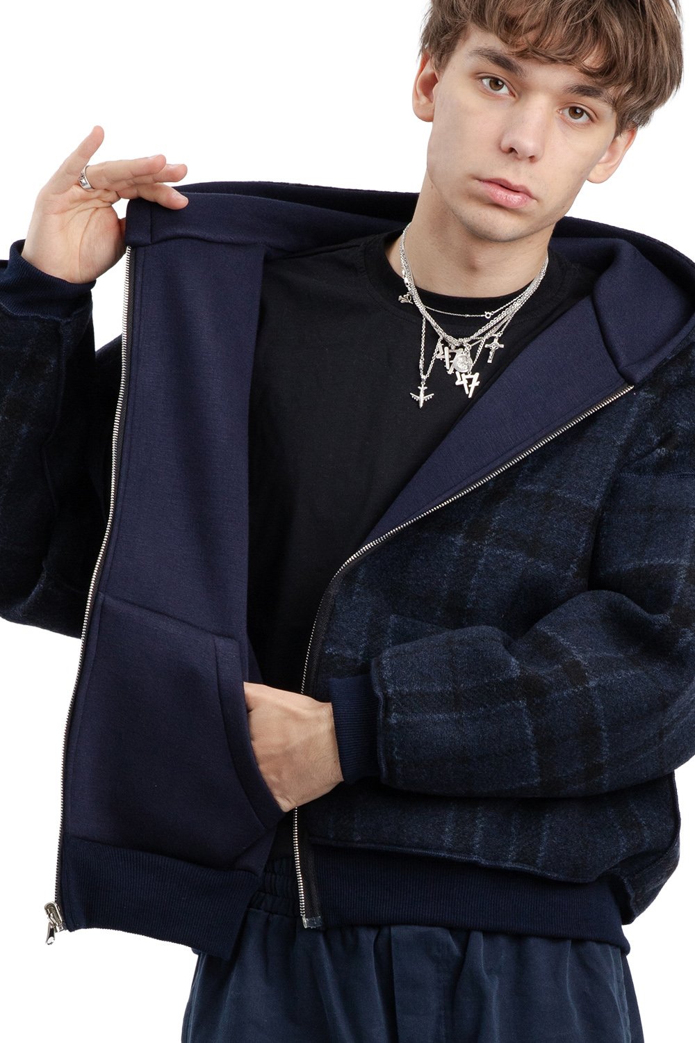 Podwójna warstwa dzianiny premium 340gsm. Skład materiału nurek na zewnątrz 40% bawełna, 57% poliester, 3% elastan. Od wewnątrz materiał w kratę: 100% wełna.