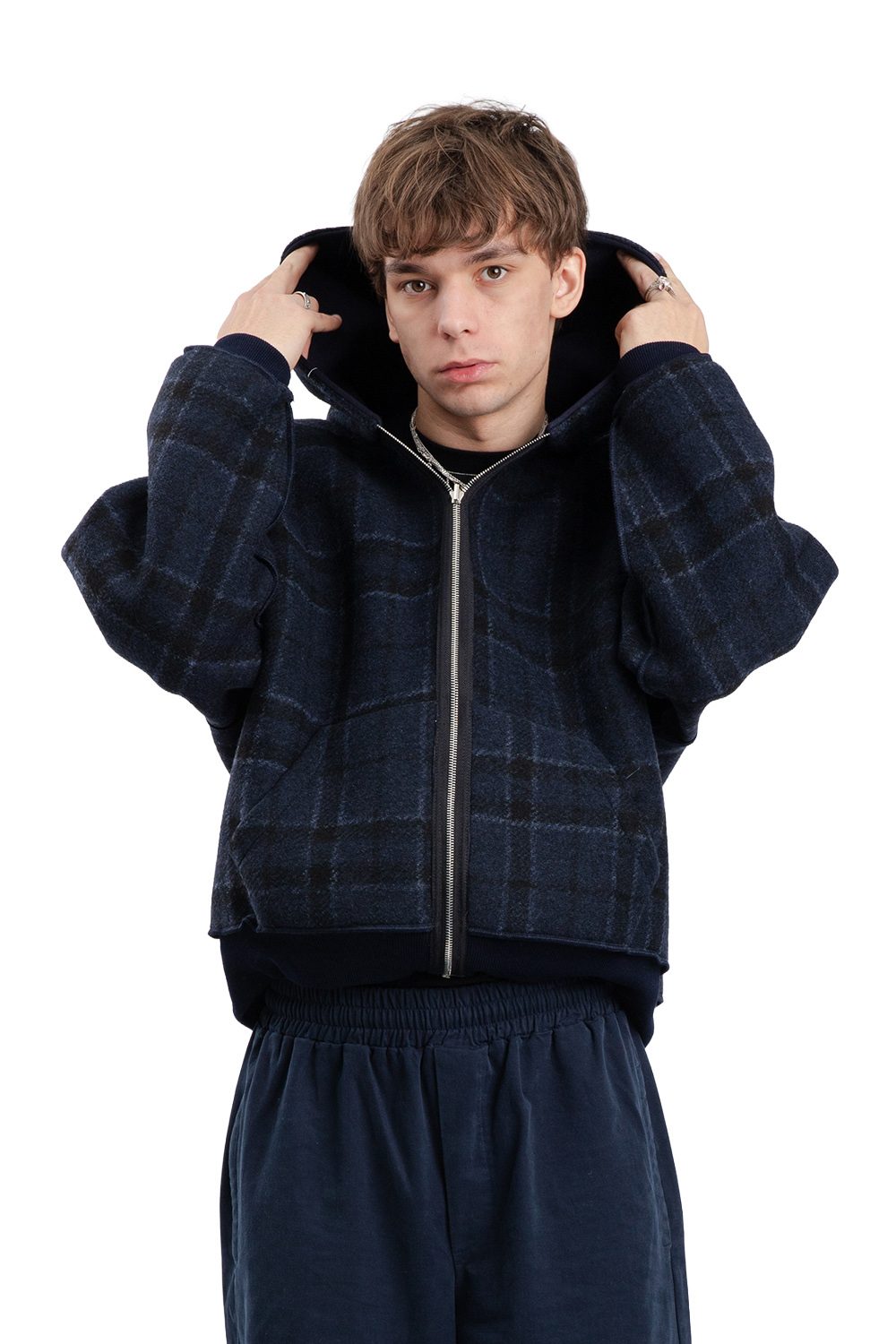 Podwójna warstwa dzianiny premium 340gsm. Skład materiału nurek na zewnątrz 40% bawełna, 57% poliester, 3% elastan. Od wewnątrz materiał w kratę: 100% wełna.
