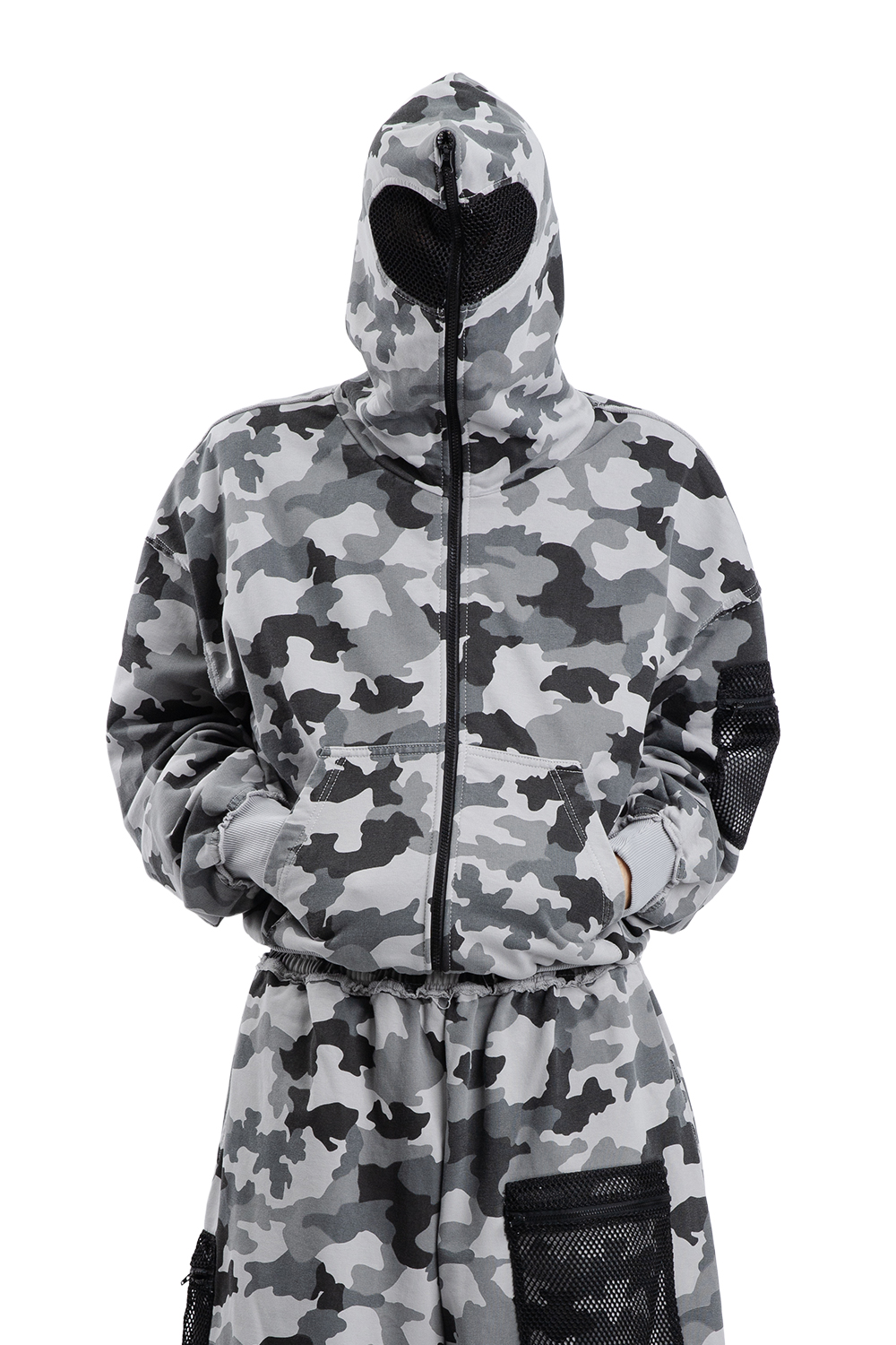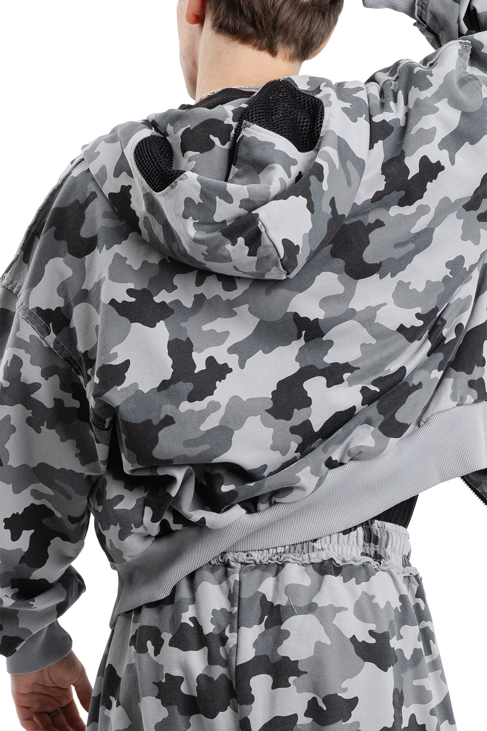 Wykonana w 100% z wysokogatunkowej bawełny dresówka o gramaturze 400gsm w unikatowym wzorze moro w kolorach szarości.