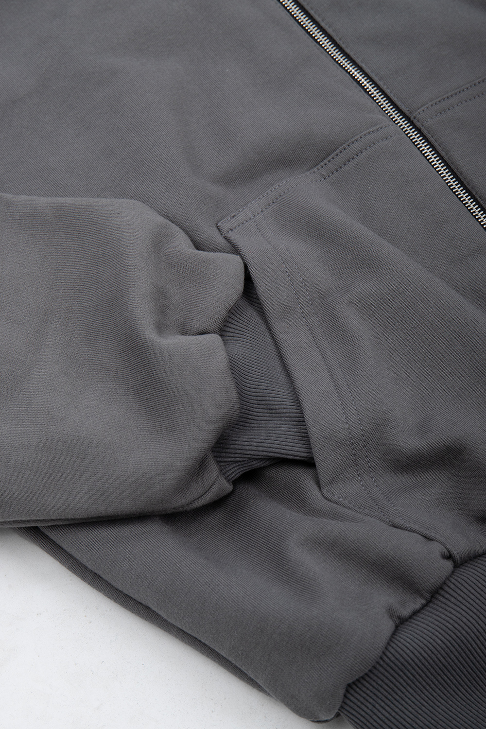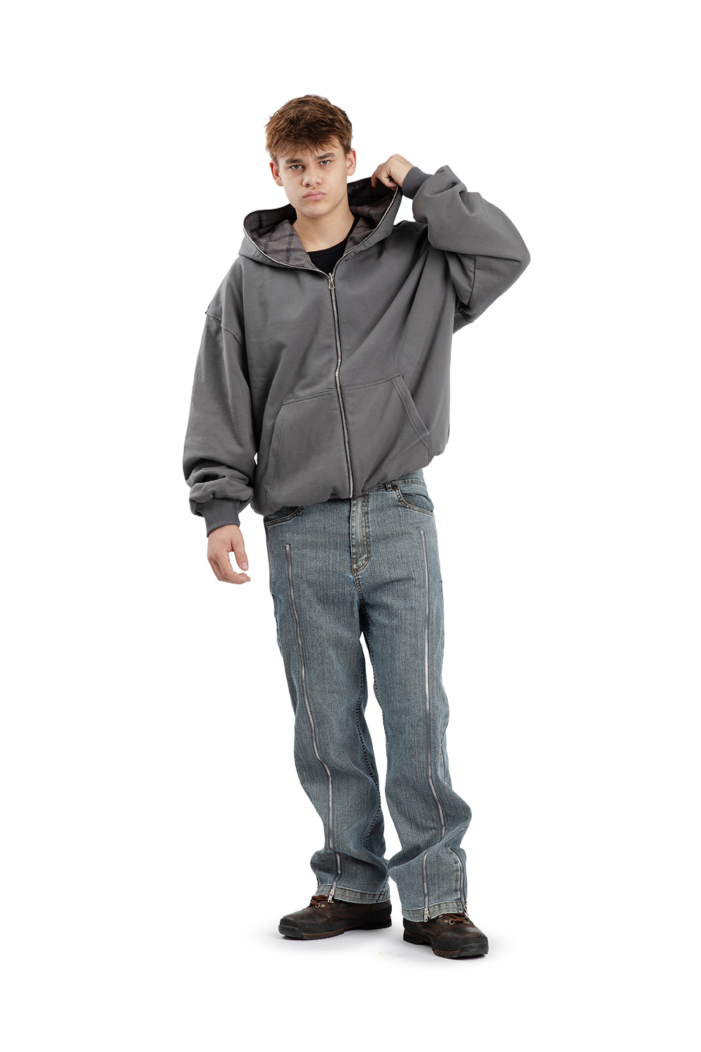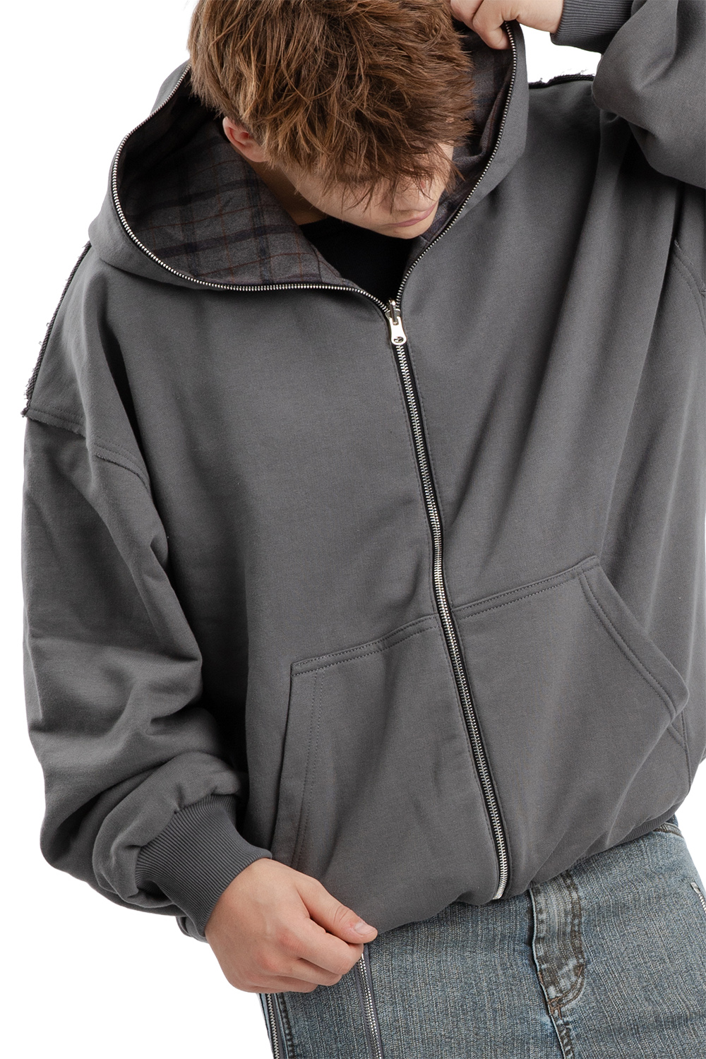 - Srebrny zamek błyskawiczny full zip sięgający po czubek kaptura