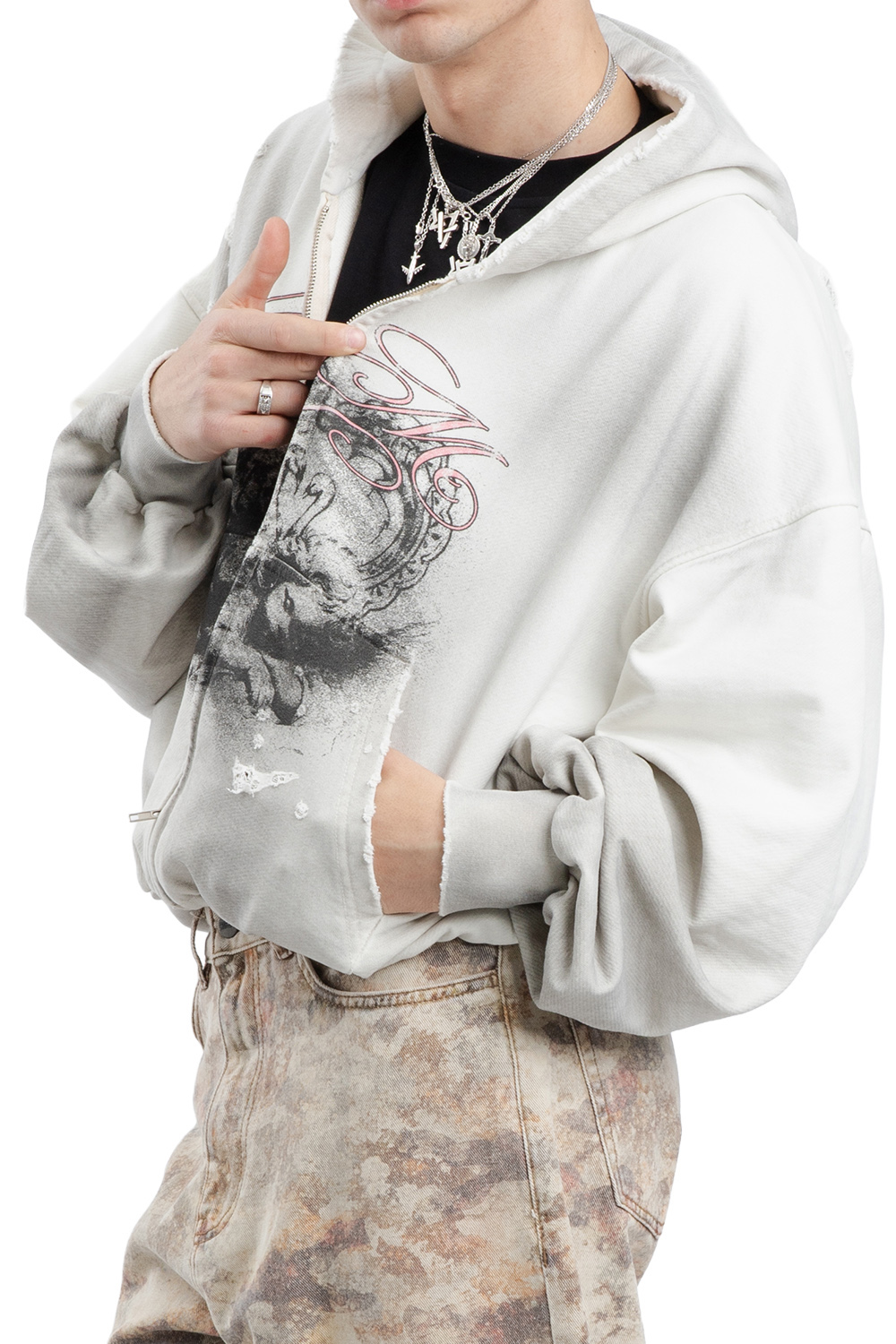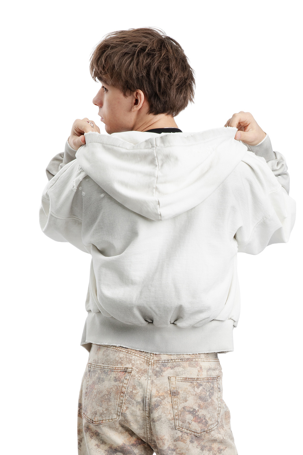 Precyzyjne przeszycia i tonalne szwy. Suwak błyskawiczny w kolorze srebrnym. Wysokiej jakości naturalna dzianina pętelkowa (niedrapana) premium 500gsm, 100% bawełna. Materiał z efektem postarzania, każda bluza zawiera unikalny wzór.