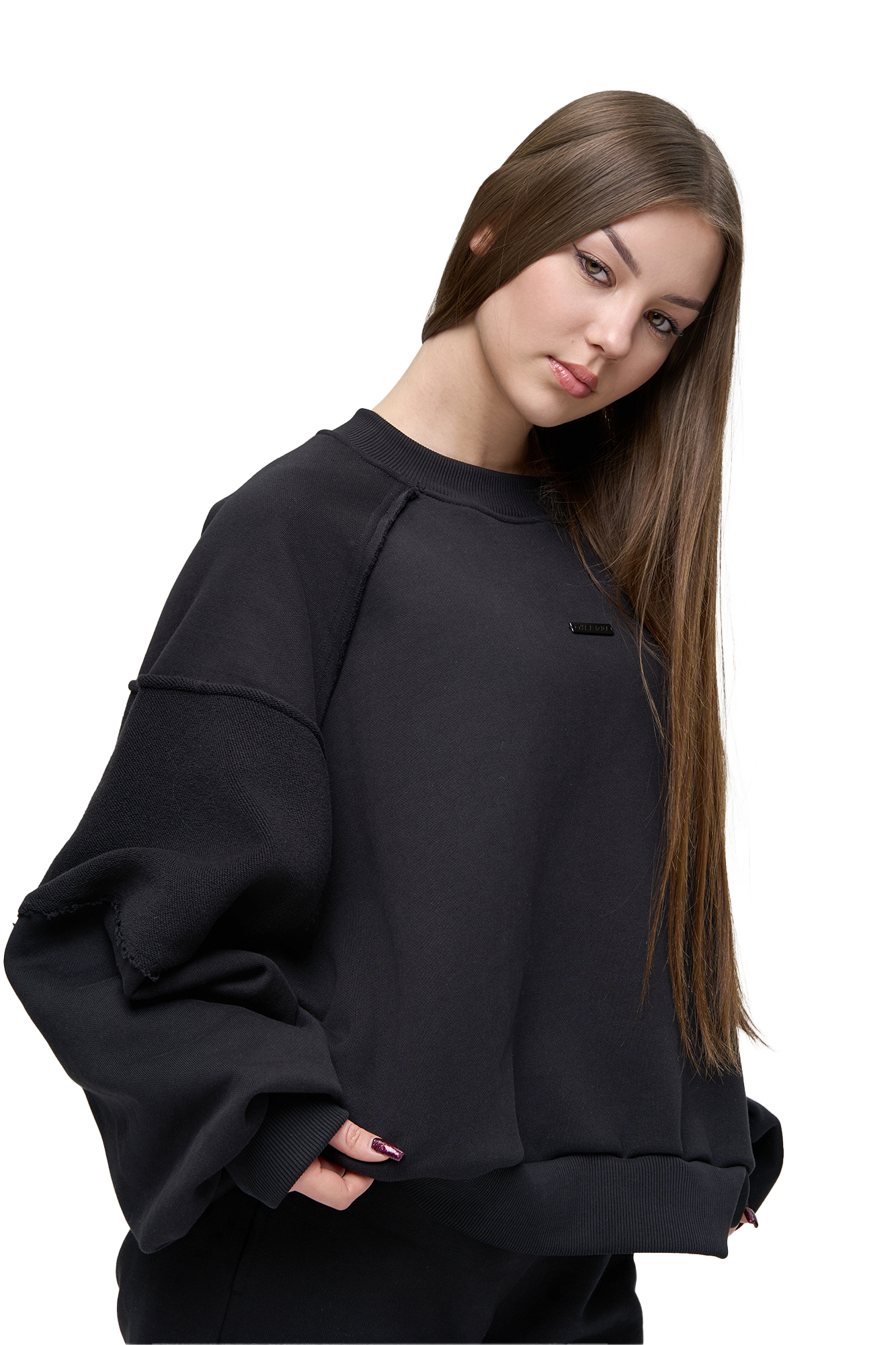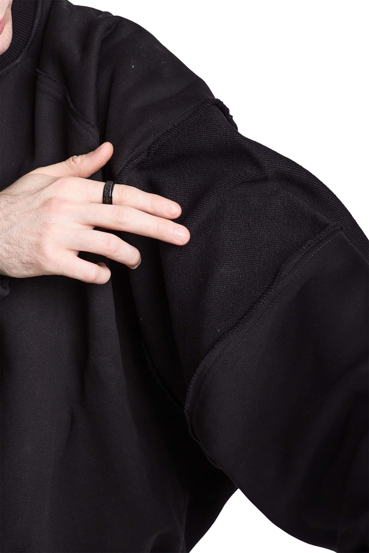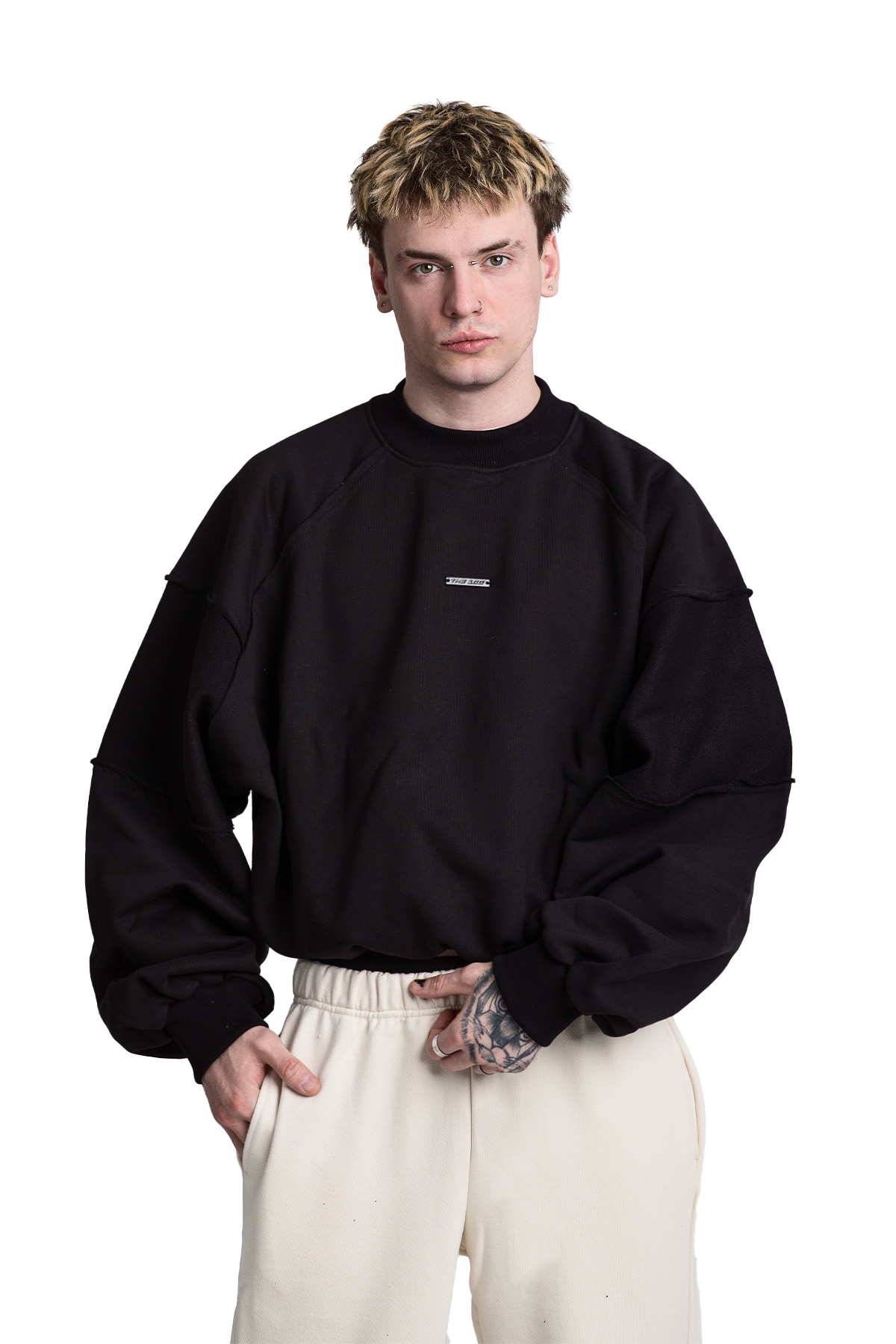 Surowe przeszycia na rękawach i froncie. Krój puffy.