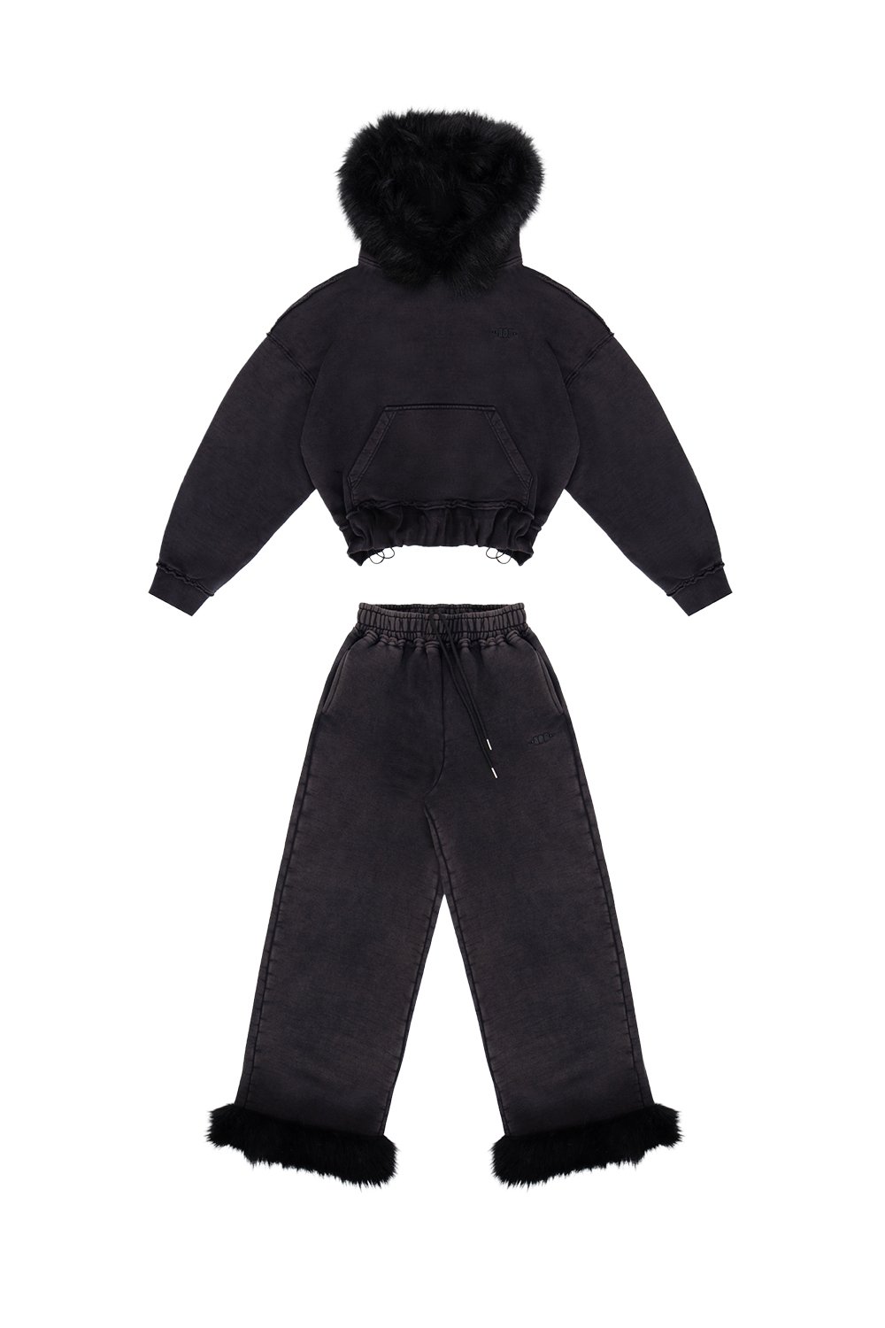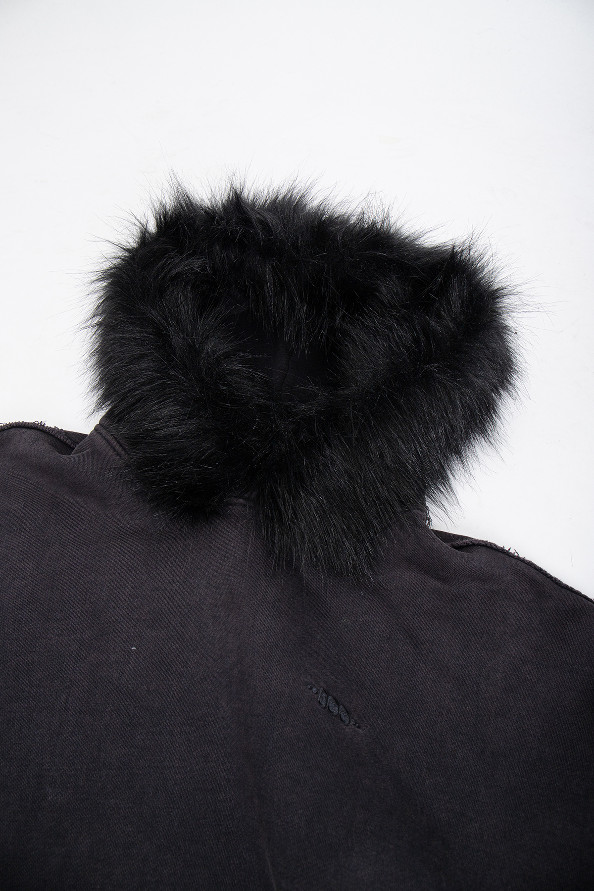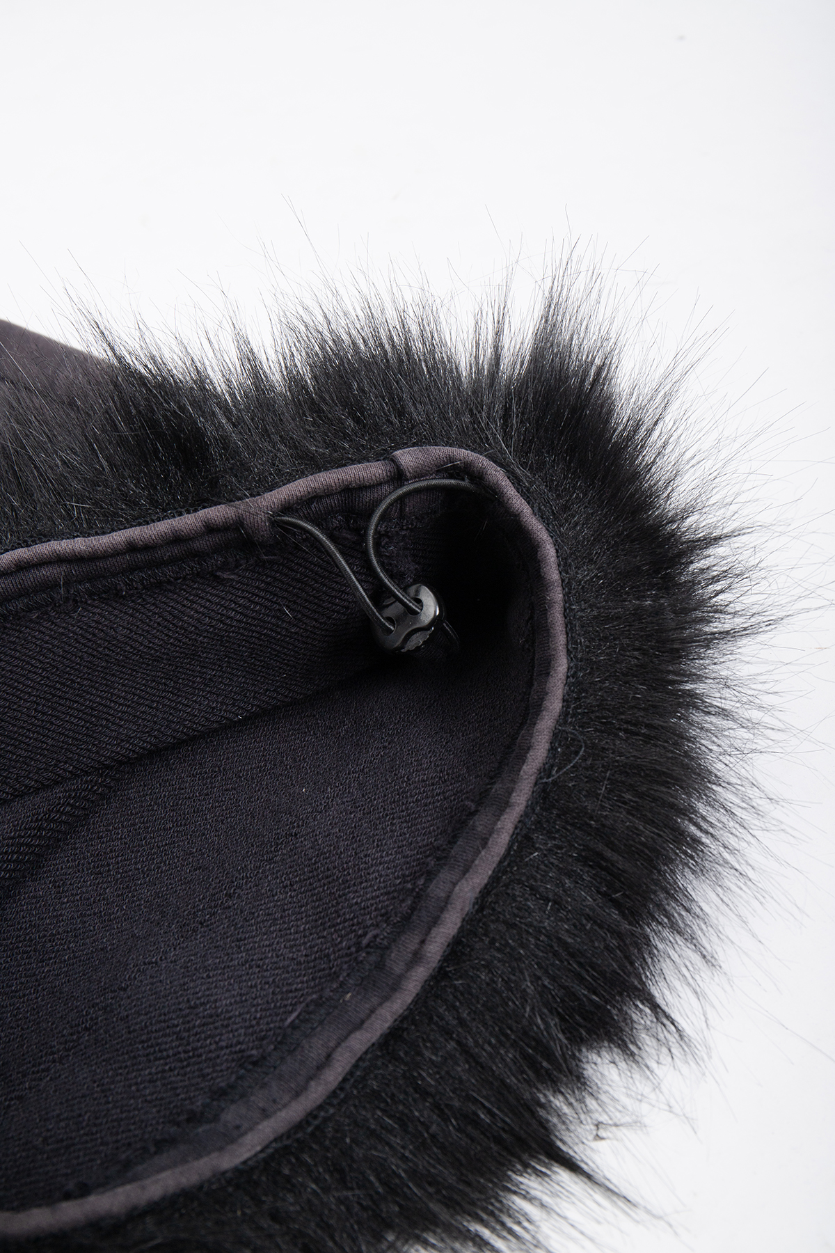 Syntetyczne futerko z kolorze brązowym wokół kaptura i na dole nogawek.
