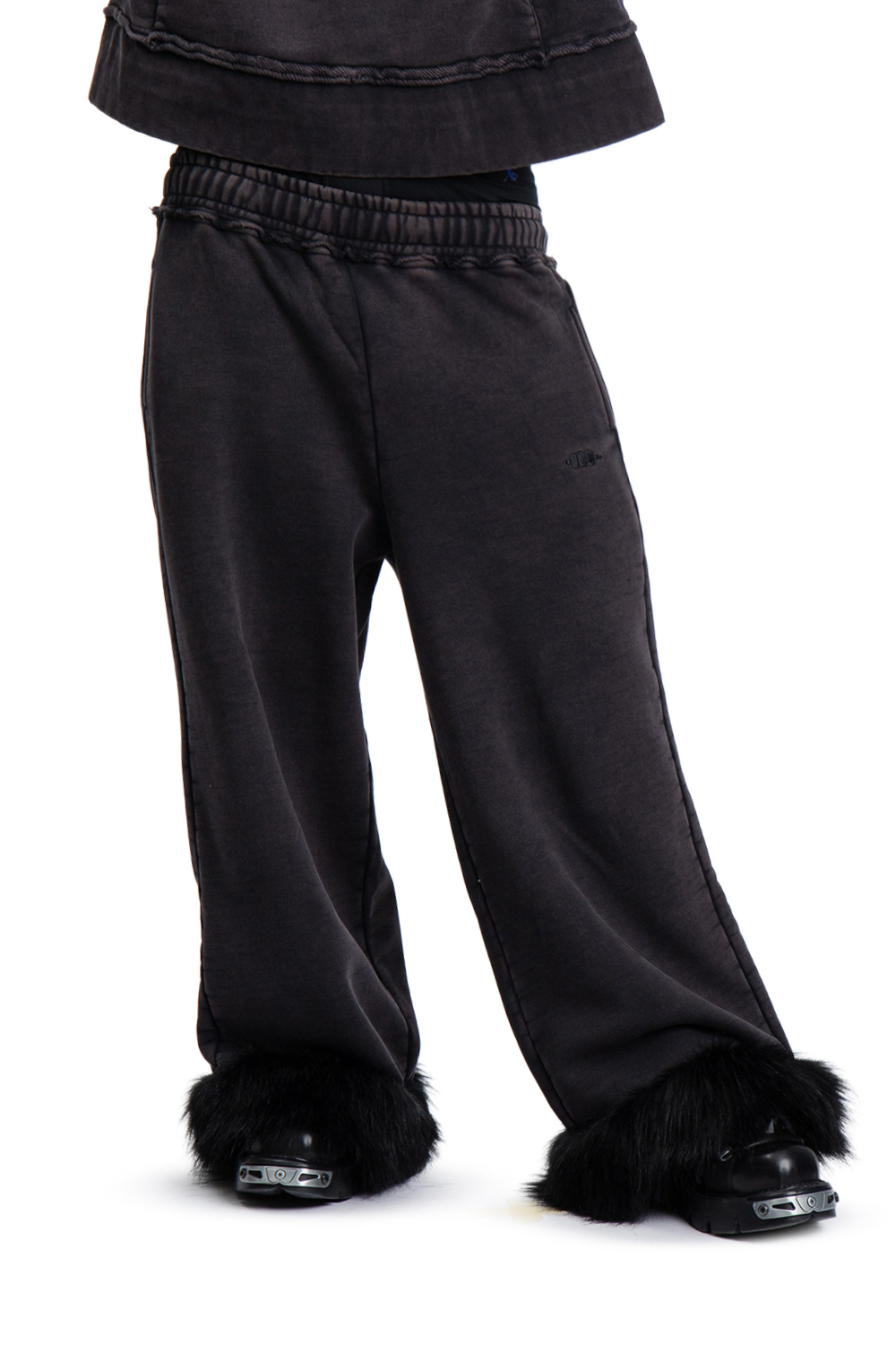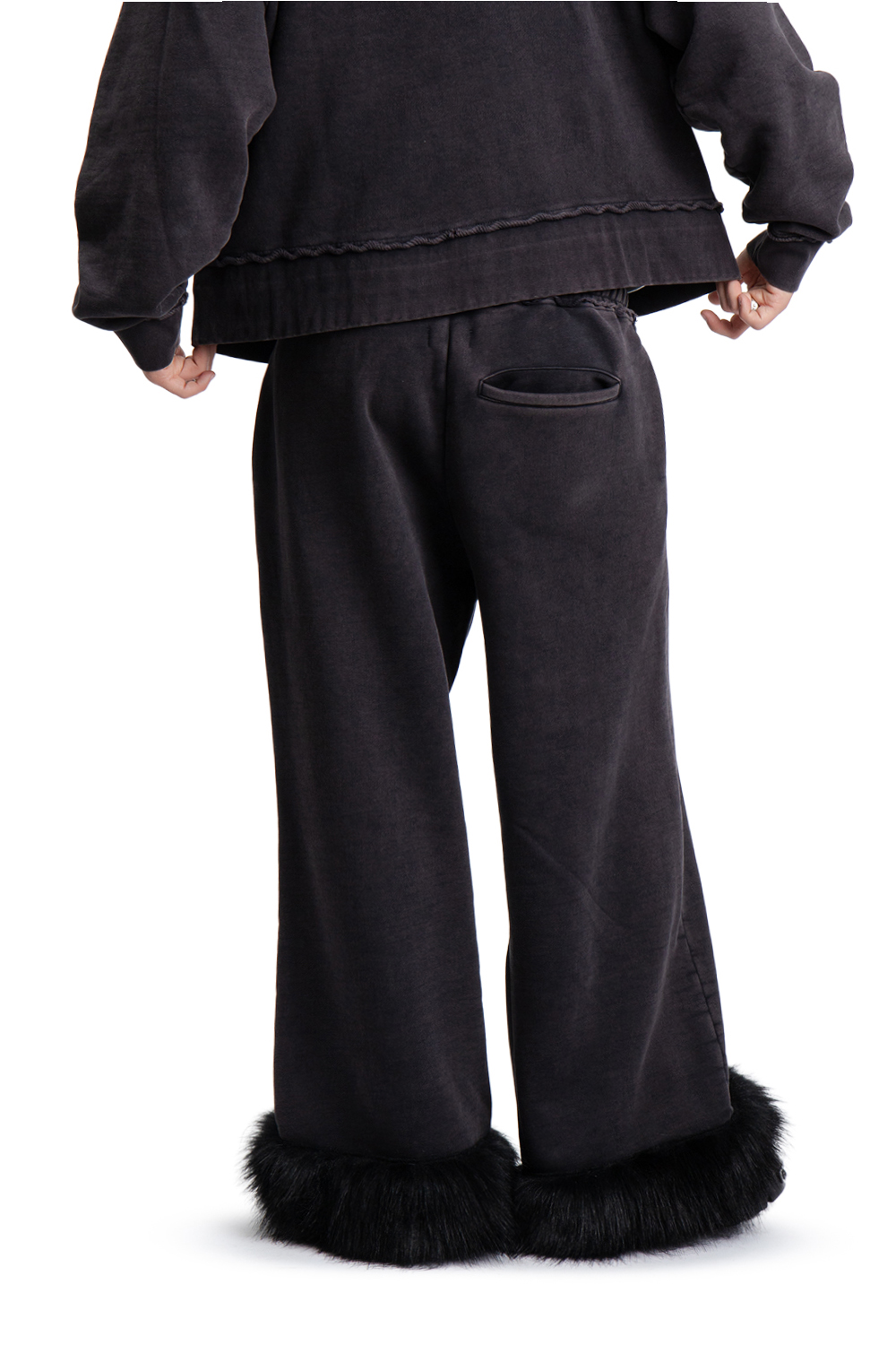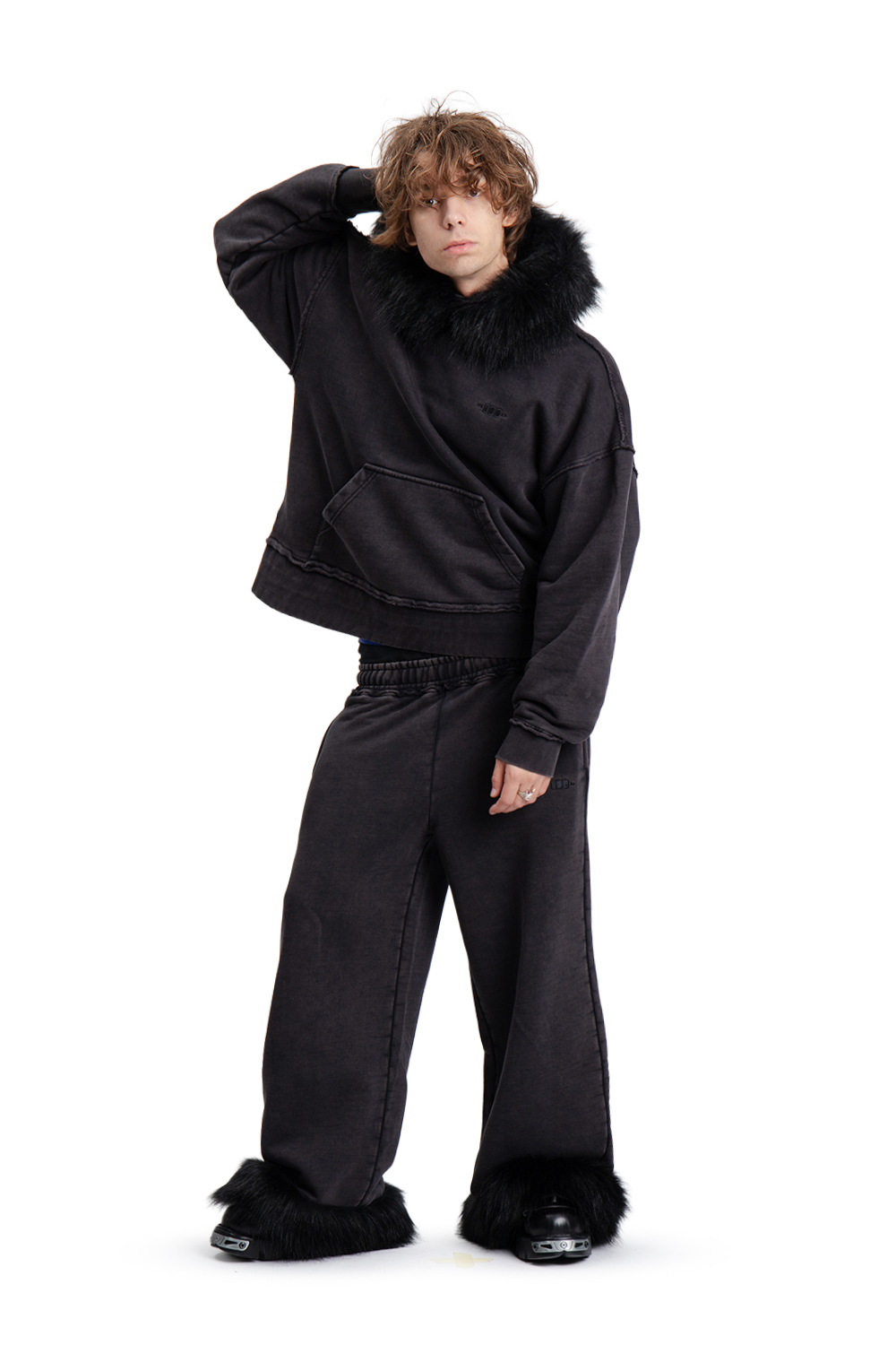 Syntetyczne futerko z kolorze brązowym wokół kaptura i na dole nogawek.